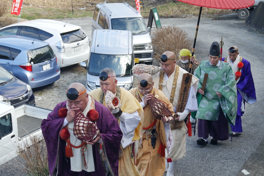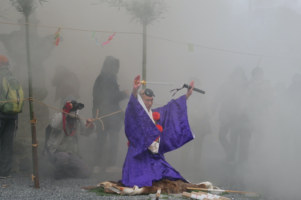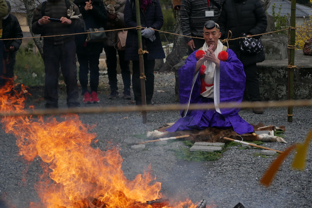伊藤:円照院の柴灯護摩法要の次第は、安岡神社の宮司様による「道場のお清め」、山伏による「破邪結界の作法」、住職による「願文の奏上」、そして「柴灯護摩修行の奉納」、柴灯護摩の残火で行う「火渡り修行」で終わります。宮司さまが登場するのは円照院独特ですが、もともと柴灯護摩が神仏習合の祭典であることもそうなのですが、何よりも宮司さまのご先祖さまが、明治の神仏判然令まで修験寺院の金剛院の住職でいらっしゃったということが大きな理由の一つです。円照院で柴灯護摩を始める当初にお声がけさせていただきましたところ、地域の宗教文化の復興に深く共感していただき、毎年ご協力いただいております。また、最近では、山伏たちが道場に揃ったタイミングで、外から旅の行者が訪れ、修験道の知識について問答する「山伏問答」をつとめます。歌舞伎役者さながらの問答で、見応えもあるのですが、問答の内容をしっかり聞くと、修験道の意義、山伏の意味や、山伏が身につけている法具の意味などが理解できます。