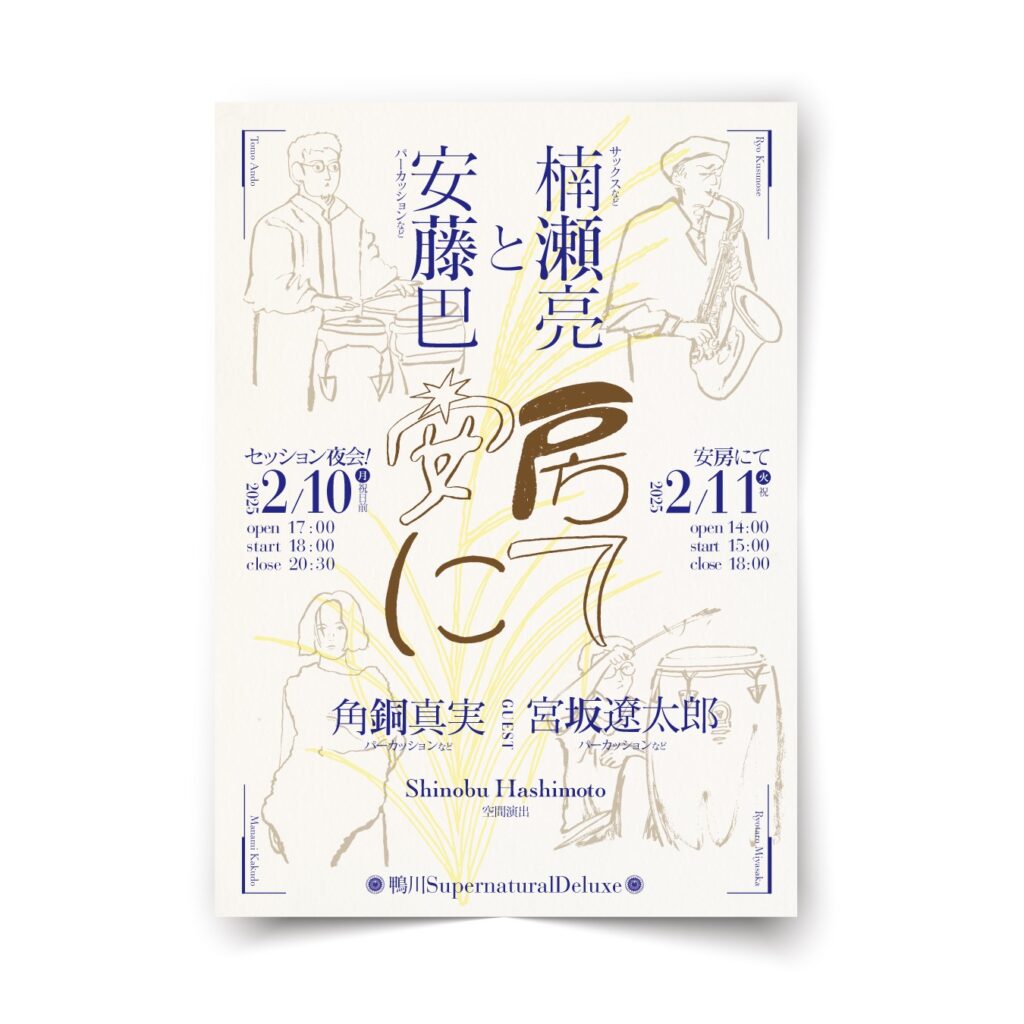 南房総エリアを拠点としながら各地を飛び回り演奏活動を続ける二人の新鋭音楽家、安藤巴と楠瀬亮。そして彼らが敬愛する音楽家たち──角銅真実と宮坂遼太郎──をゲストに迎えて、二日間に渡る音楽の冒険が鴨川スーパーナチュラルデラックスで繰り広げられます。
