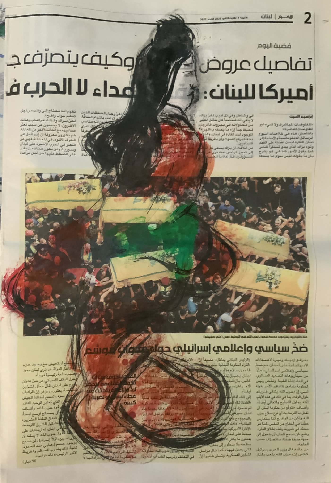 アツコ・ベンテン・バルー「レバノンの見返り美人」(新聞紙、グワッシュ、墨|60cm × 35cm|2025年)