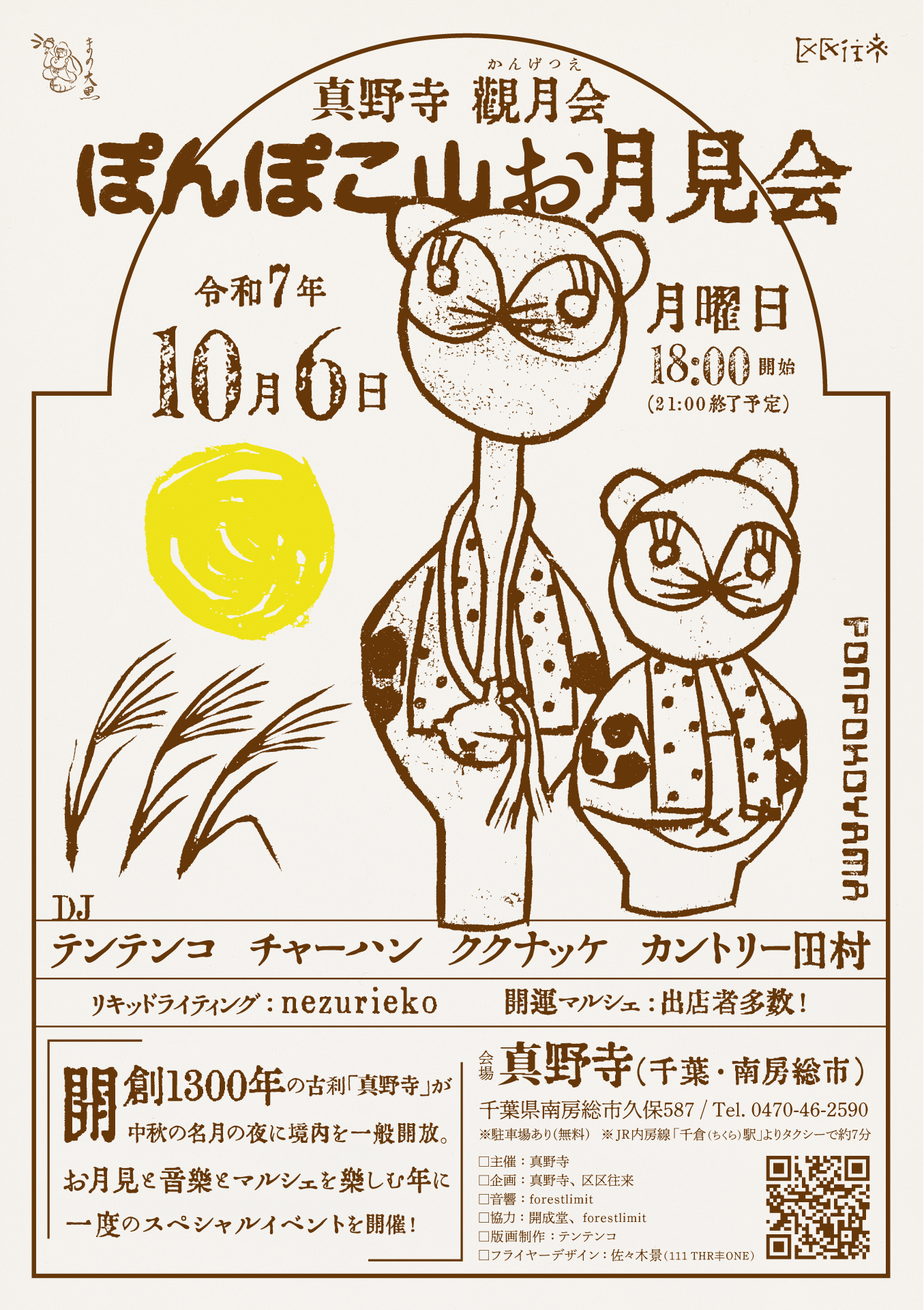 本尊である秘仏「覆面千手観音像」と商売繁盛の御利益がある「大黒天」が祀られている本堂の前には、〝里山で繰り広げられているたぬきたちのパーティー〟がテーマのDJイベント「ぽんぽこ山」のレギュラーDJたちが集結。月明かりと照明で照らされた寺院内の非日常的な景色に、たぬきも踊り出すような愉快でご機嫌な音楽が重ねられていきます。