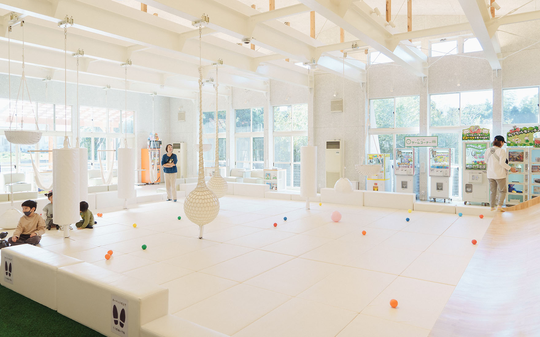 雨でも遊べる、滑り台やサンドバッグのある空間。それ囲うように並ぶソファでは、「ぞうさんすむーじー」のドリンクでゆったりタイムを。(保田小学校ウェブサイトより)